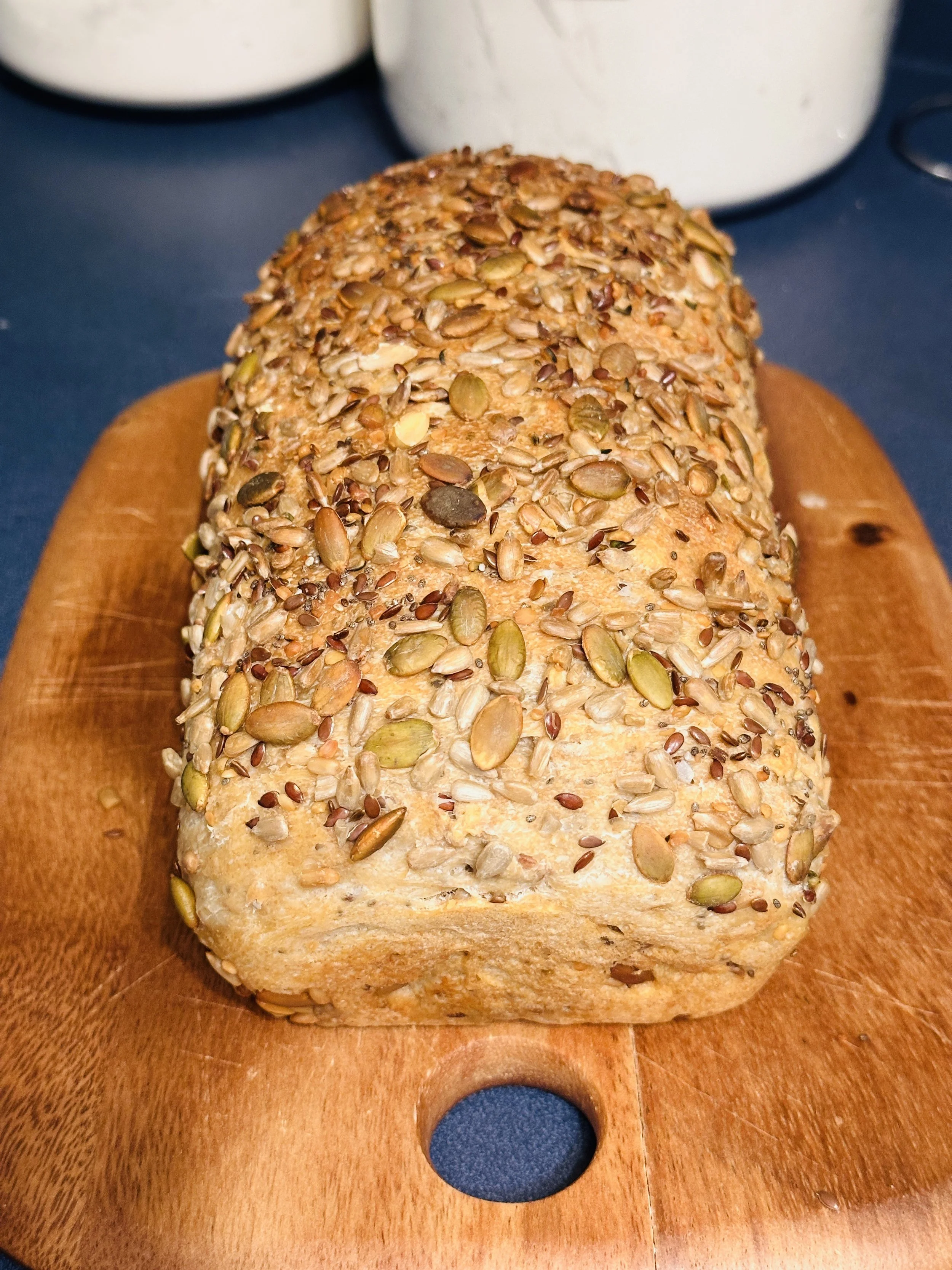 Try this hearty, nourishing loaf with a perfectly soft crumb and a golden, chewy crust. Naturally leavened with active sourdough starter, it’s slow-fermented for deep flavor with improved digestibility. Packed with a wholesome mix of seeds - like sunflower, flax, sesame and pumpkin - this bread delivers a subtle nutty crunch in every bite. It’s sturdy enough for sandwiches, yet tender enough for toasting. This will quickly become an every day favorite!